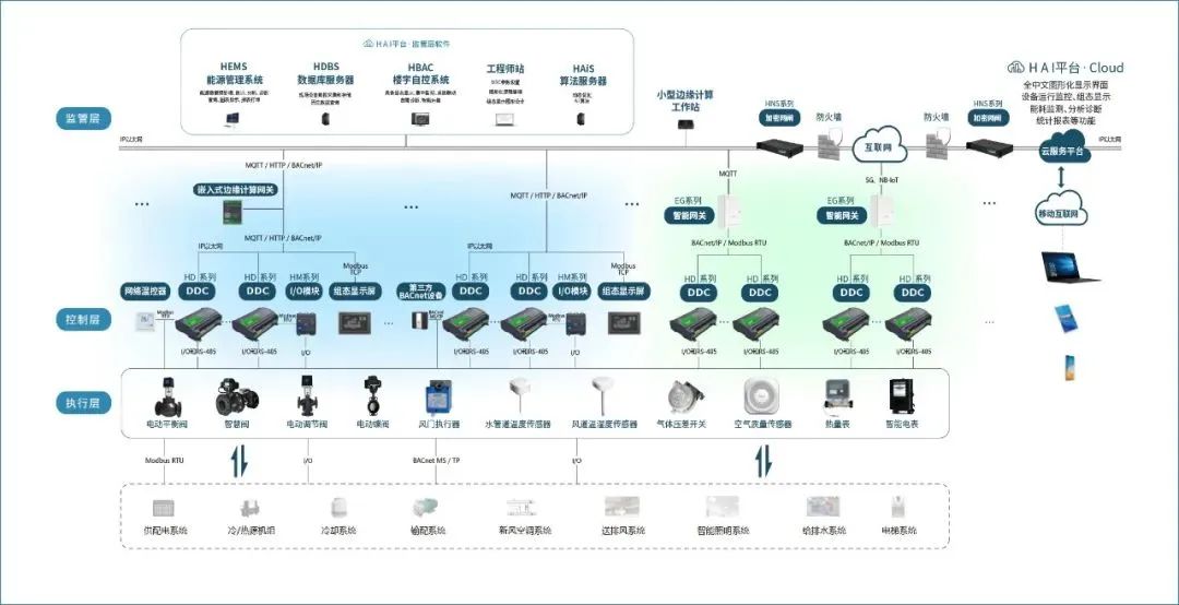 海林自控將物聯網技術融入DDC,加入更多AI算法,使其具備豐富的接口、靈活的組網并支持多種標準通訊協議,可以對樓宇內的冷/熱機組、冷/熱源、空調機組、新風機組、照明和給排水等機電設備的管理控制,實現分散控制,集中管理,為樓宇創造優質的空氣品質的同時,實現節能降耗。