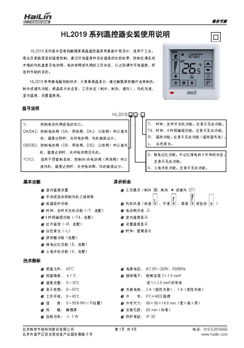 HL2019系列豪華型高檔觸摸屏液晶溫控器采用最新外觀設計,適用于工業、商業及家庭居室的溫度控制。通過環境溫度和設定溫度的比較結果,控制空調系統末端的風機盤管及電動閥、電動球閥或風閥的工作狀態,以達到調節環境溫度、舒適和節能的目的。