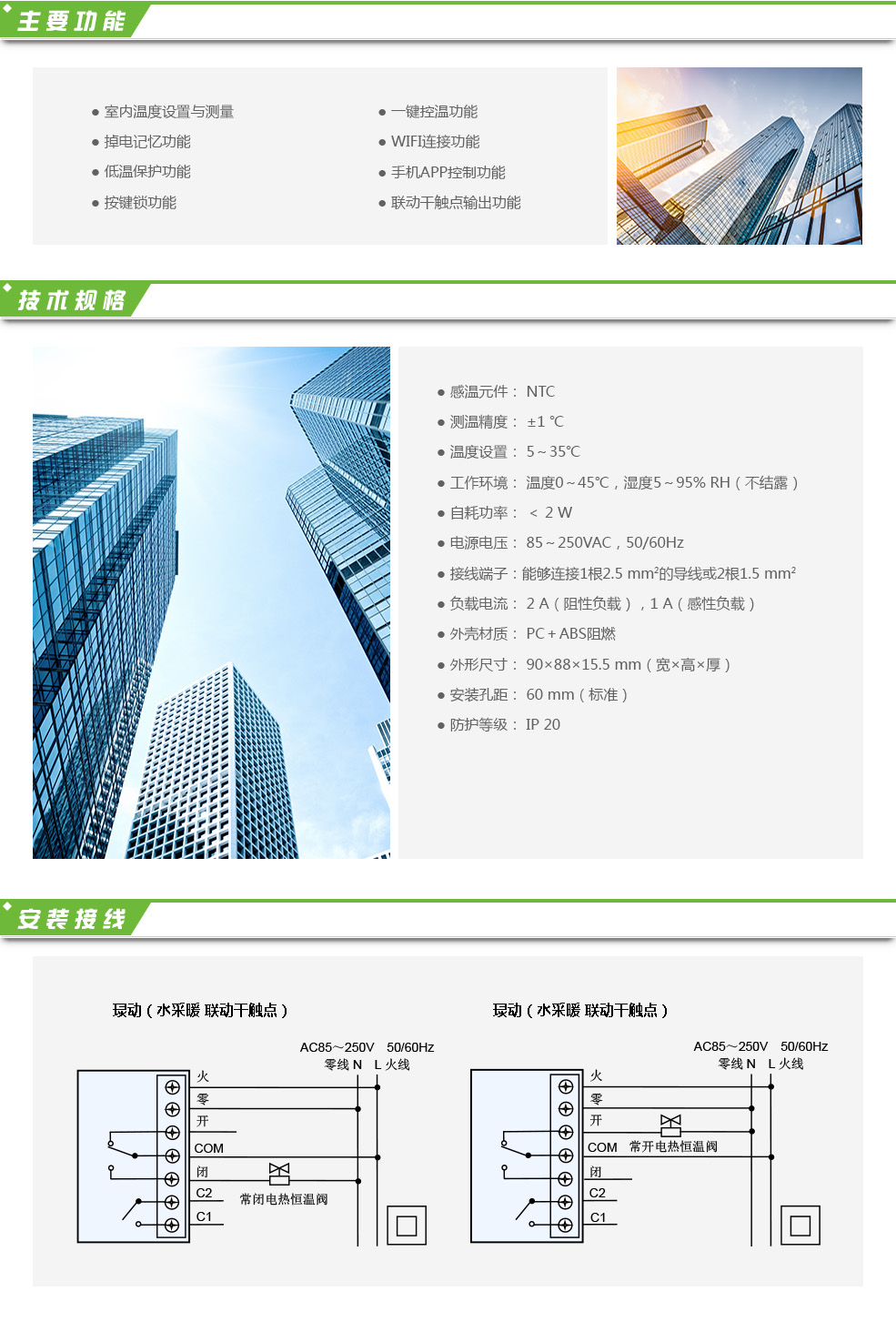 ?動(水采暖)溫控器(聯動干觸點)是大液晶顯示供熱專用溫控器,適用于工業、商業及家庭居室的溫度控制,控制供熱閥門的開啟與關閉。帶有一組干觸點輸出,聯動鍋爐輸出。